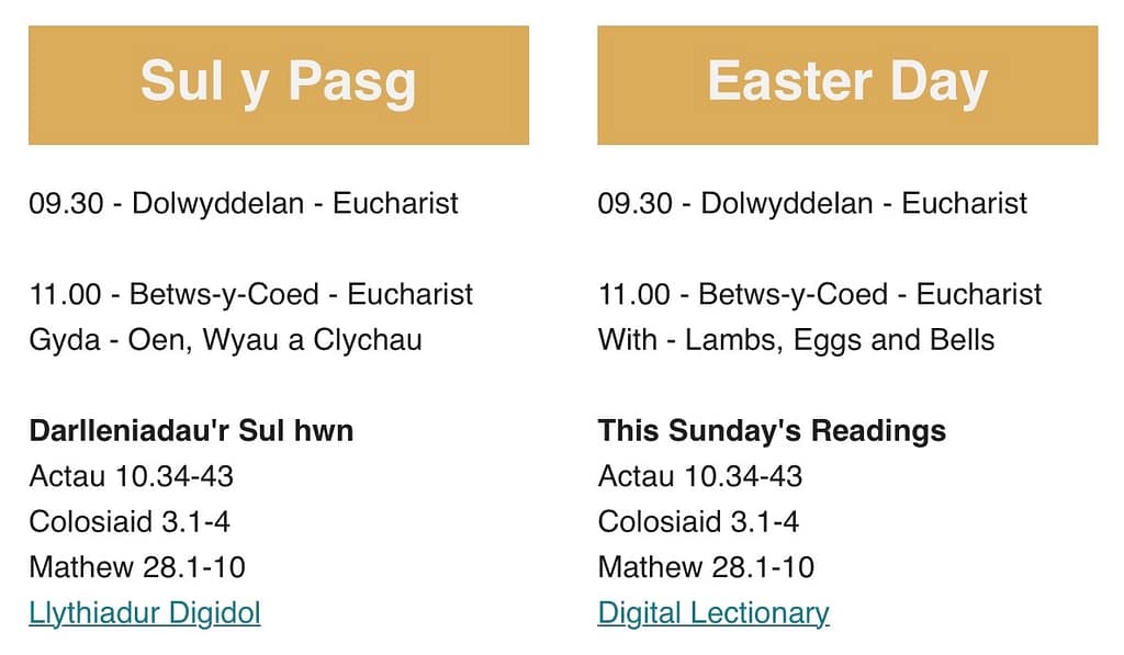 Bob dydd Sul, bydd o leiaf un gwasanaeth yn rhywle yn ein Hardal Weinidogaeth. Weithiau, cynhelir y gwasanaethau hyn yn yr awyr agored fel Addoli yn y Gwyllt, ac mae angen cysylltu â’r rhai sy’n trefnu’r rhain i ymuno â hwy. Mae rhai yn wasanaethau traddodiadol fel yr Ewcharist neu’r Cymun Sanctaidd lle rydym yn dathlu Swper yr Arglwydd. Weithiau, cynhelir Gwasanaeth Gosber neu wasanaeth gweddi Taizé. Weithiau gall fod yn weithred syml o addoli ar gyfer achlysur arbennig. Beth bynnag yw’r gwasanaeth a lle bynnag y caiff ei gynnal – croeso cynnes i bawb!