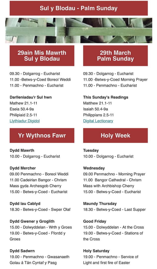 Ymunwch ni am wasanaeth Cymun siml o gwmpas yr Allor yng nghanol yr wythnos â wedyn panad a sgwrs – croeso i bawb.